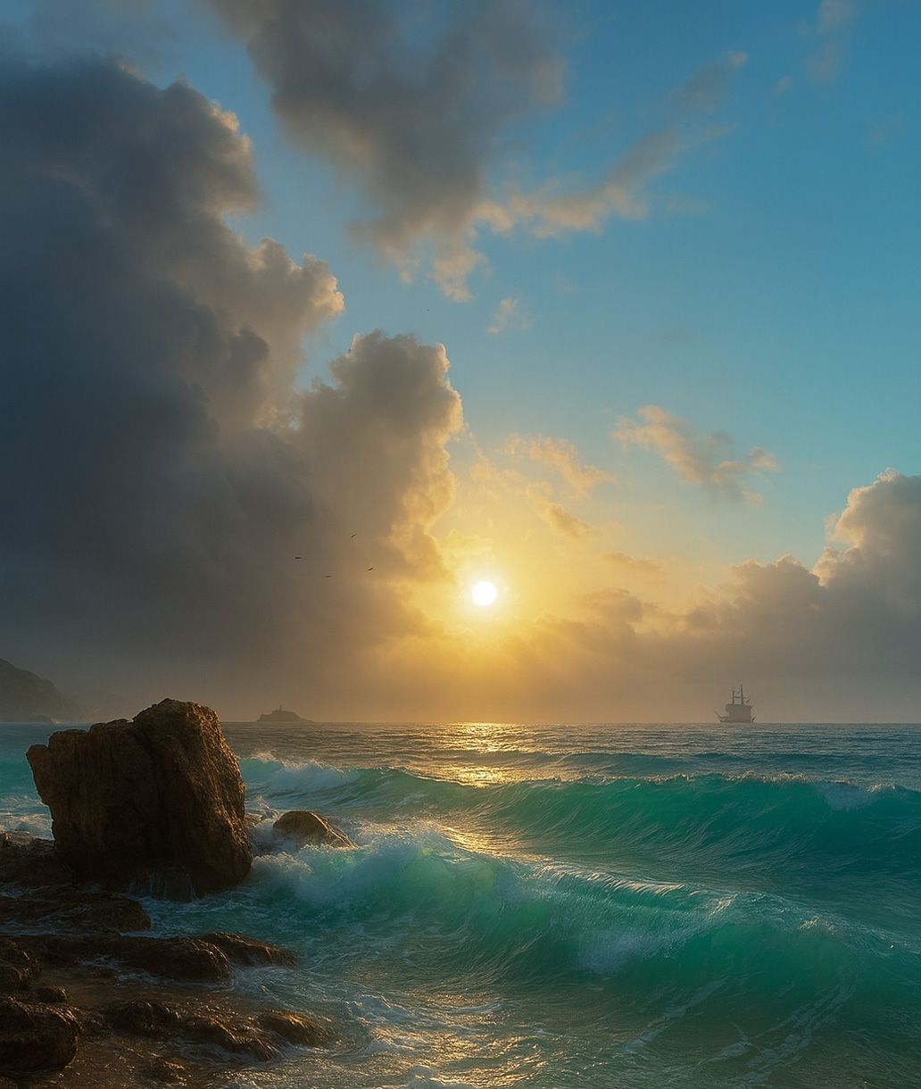 – Передача глубины морского пространства: от переднего плана с волнами до далекого горизонта