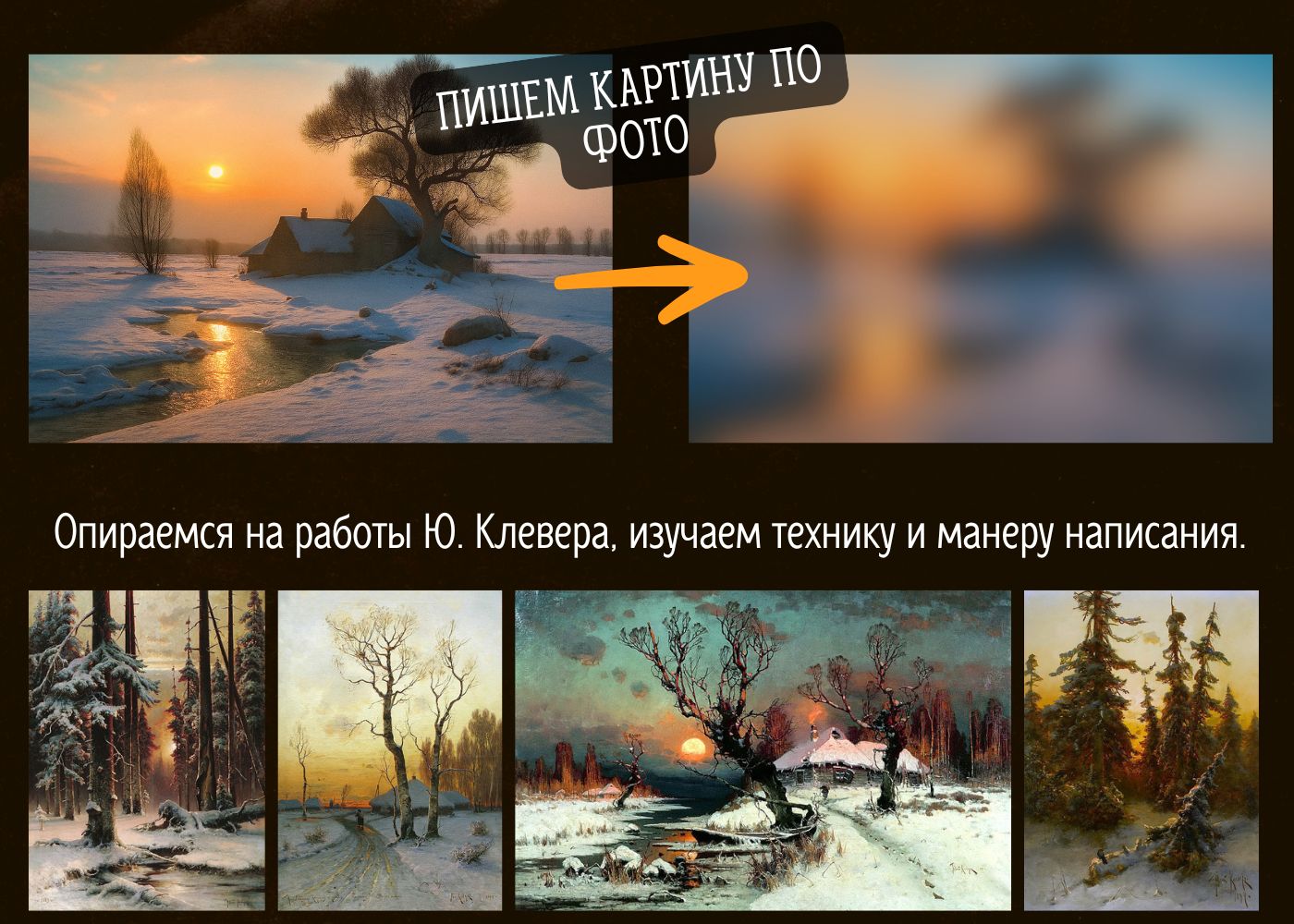 После этого перейдем к романтической манере Клевера — разберем его секреты передачи атмосферы и напишем вторую картину, осваивая его уникальный подход к композиции и настроению.
