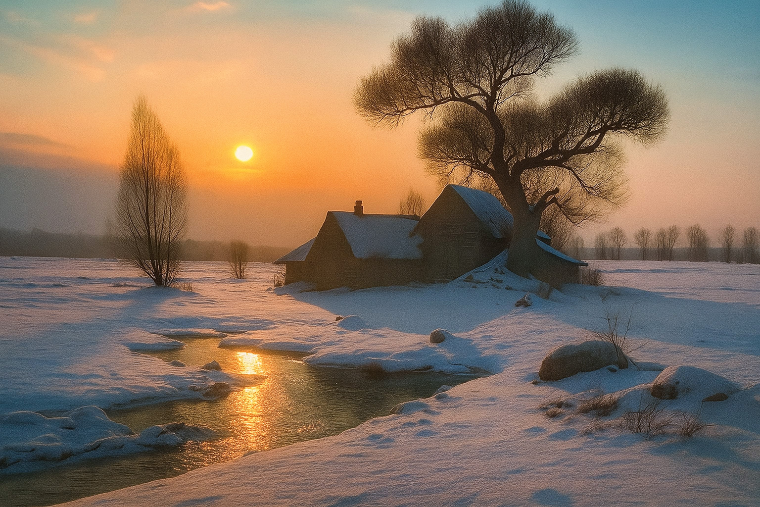 – Сочетание теплых и холодных оттенков в зимнем пейзаже