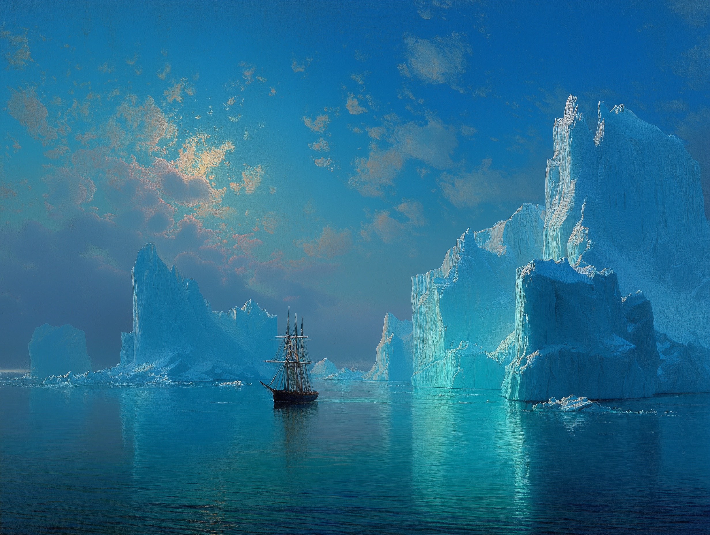 Эта работа раскрывает секреты построения масштабных ледовых форм, чистых холодных оттенков и выразительных силуэтов гигантов-айсбергов. Вы научитесь изображать спокойную воду с отражениями, мягкое северное небо, а также создавать композицию, в которой маленький корабль или детали подчёркивают грандиозность природы.